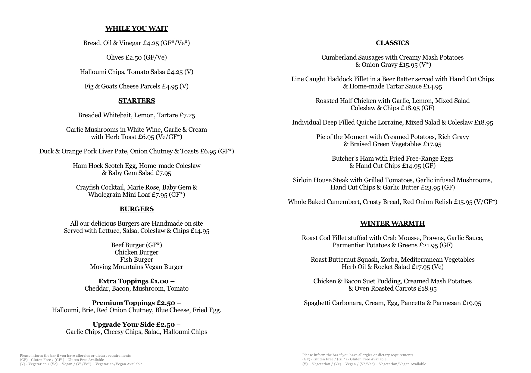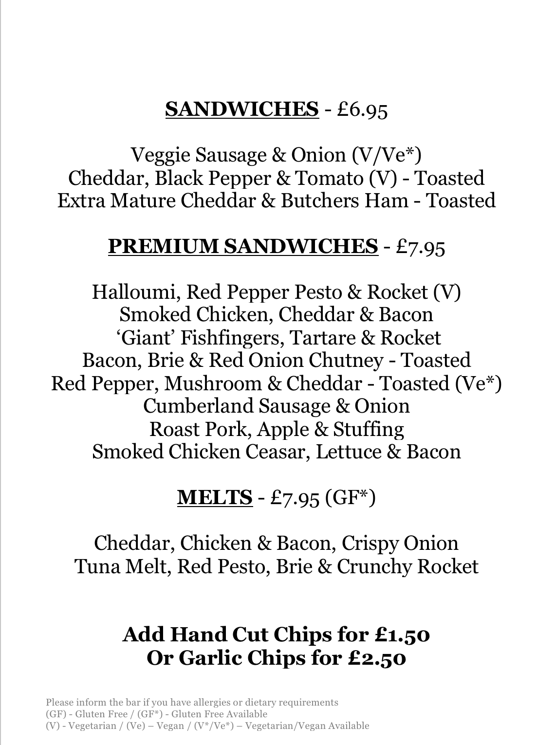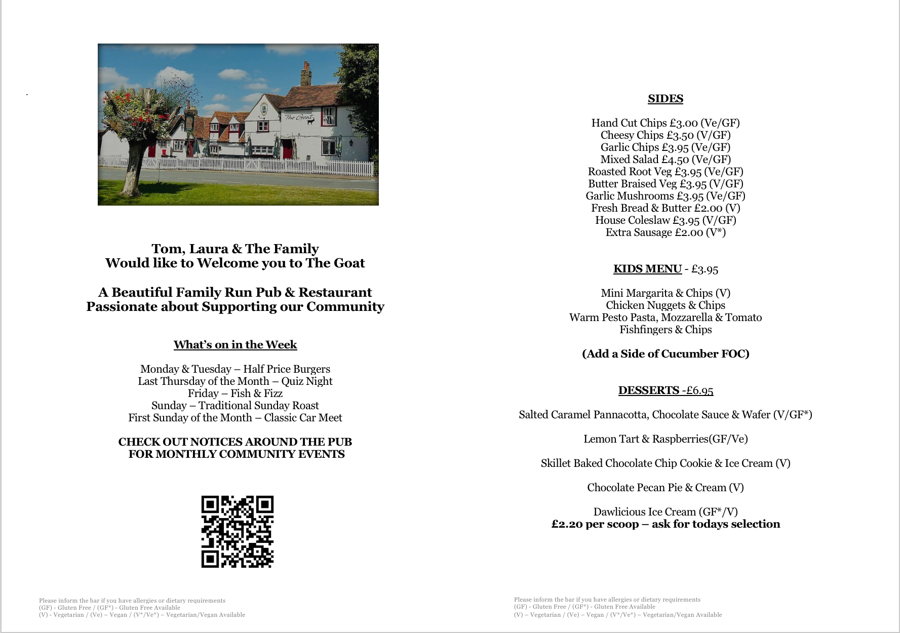 We specialise in traditional British food done well. Choose from classic British pub favourites including a large selection of vegetarian, vegan and gluten free choices all prepared to order. Our ice creams are very unique and are produced at a local dairy farm and our Sunday roast is legendary and extremely popular so please give us a call to book a table